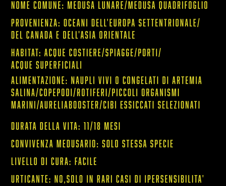 Indiscutibilmente la specie di medusa più diffusa e allevata, sia negli acquari pubblici che in quelli domestici. Combinazione vincente è stata la relativa facilità di allevamento e l'elevato numero di riproduzione in cattività. Presenti in tutto il mondo, attualmente si contano 28 specie riconosciute di Aurelia, un vero e proprio incubo tassonomico, le meduse quadrifoglio possono presentare caratteristiche fisiche diverse a seconda delle condizioni di allevamento. Sicuramente rientra nell'ambito di una specie per principianti, con una distribuzione così ampia ne esiste una specie per ogni clima. La maggior parte delle specie allevate e riprodotte oggi sono temperate e prosperano alle normali temperature domestiche. Le Aurelia possono essere allevate a una densità di esemplari più elevata nel medusario, rispetto alla maggior parte delle altre specie. La combinazione di tentacoli corti e movimenti rilassati fa sì che non si aggroviglino come potrebbero fare altre meduse. Non sono molto attivi e hanno bisogno di un piccolo aiuto per essere spinti in giro per la vasca, ma non amano i flussi eccessivamente alti. Sebbene il loro effetto pungente sia debole sugli esseri umani, le meduse quadrifoglio non vanno d'accordo con altre specie. La chiave per il successo con le Aurelia Aurita risiede principalmente nel flusso delicato e nella qualità del cibo, per il resto si abituano molto facilmente a valori non del tutto precisi, basta dargli tempo e non spostarsi eccessivamente lontano dalle loro richieste. I segnali di benessere per questo animale sono i piccoli tentacoli attorno l'ombrello belli estesi e un nuoto costante, scorrendo troverai qualche video.