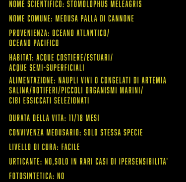 Questa specie di medusa grazie alla sua forma e con i suoi movimenti vivaci e decisi viene chiamata palla di cannone, basta vederla nuotare dal vivo per capirlo. Sicuramente rientra tra le prime specie che consiglio ma a differenza delle aurelia aurita, la palla di cannone(BLUE STOMOLOPHUS MELEAGRIS) ha delle necessità che se riesci a gestire ti proietta agli step successivi per diventare un abile collezionista di meduse...ovviamente vive. Nelle giuste condizioni cresce molto rapidamente, ma con una crescita rapida e un metabolismo elevato arrivano degli svantaggi. Il primo è il flusso adeguato che gli permetta di muoversi velocemente e di continuo perchè sono molto molto attive, quindi la portata oraria della pompa di risalita deve essere alta e regolata spesso in base alla crescita. Il secondo svantaggio è il cibo che deve avere a disposizione, svuotando velocemente lo stomaco per la loro vivacità devono ricevere altrettanto cibo per rimanere attive e qui arriva il famigerato manico. Se dai tanto cibo loro stanno momentaneamente bene ma la qualità dell'acqua rischia di crollare facendo saltare la stabilità della vasca, poi se offri cibo NON vivo, finirà sul fondo peggiorando la situazione velocemente perchè la gestione delle meduse non è come il marino classico con la fauna bentonica che fa da spazzino.....NON abbiamo sabbia roccia o anfratti. Ci sono diverse soluzioni che possono aiutarti tra cui la temperatura bassa che le rende piu' pigre quindi meno fameliche, anche il cibo vivo aiuta perchè essendo vivo rimane in colonna e se non viene predato con la prima abbuffata, rimarrà a disposizione per quella successiva senza inquinare....poi cosa molto importante, bisogna conoscere la propria vasca con la velocità di smaltimento dei rifiuti che varia e i cambi di acqua fatti nei momenti opportuni. Tutta roba che sperimentando si impara velocemente. Se la passione ti spinge non fermarti al primo ostacolo, le meduse palla di cannone ti daranno parecchie soddisfazioni, scorrendo troverai qualche video.