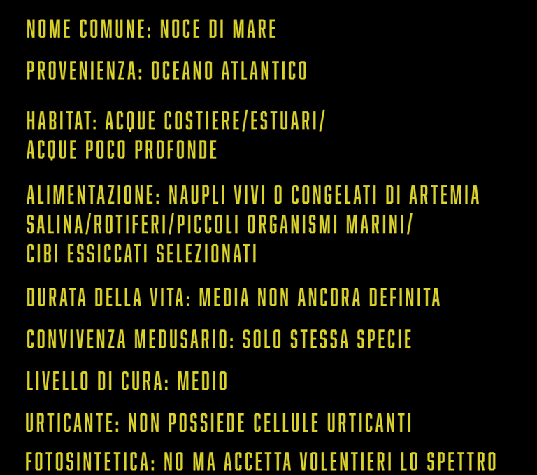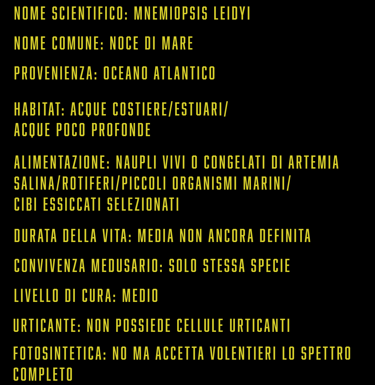 Questi organismi marini molto particolari non sono meduse ma entrano comunque a far parte della mia collezione per la loro similitudine parziale a livello di gestione con le meduse. Mnemiopsis Leidyi o noci di mare appartengono alla specie degli ctenofori e la loro esistenza risale a 350 milioni di anni fa. Una delle loro particolarità sono i flussi luminosi colorati che riescono a farci vedere tramite il frazionamento ottico della luce , che grazie al nuoto tramite piccole ciglia rivelano le diverse lunghezze d'onda dello spettro luminoso come un arcobaleno. Sono ermafroditi autofertili, non solo sono nello stesso tempo entrambi i sessi ma addirittura si autofertilizzano............Riescono a ringiovanire preservando la loro vita e raggiungono la maturità sessuale dopo pochi giorni dalla nascita, insomma è una macchina da colonizzazione globale. Come allevamento e gestione non esiste un protocollo univoco e diversi aspetti in cattività sono ancora da scoprire. I parametri di allevamento che ho riscontrato sono molto vari e discordanti, facendomi credere che riescono ad abituarsi a valori di acqua folli, soffrono la presenza minima di ammoniaca e nitrito ma tollerano nitrato, sperando di essere smentito attendo qualche pubblicazione online di persone che hanno stabilito realmente una base solida per allevare e far riprodurre questi animali simili ma diversi dalle meduse. La stabilità continua dei diversi valori di nutrienti/inquinanti permette la gestione di questi animali, non dimenticando l'importanza della regolazione del flusso essendo animali molto fragili. Se nutrite con troppo cibo tendono a rigurgitarlo mentre riguardo al loro scarto metabolico, inquinano parecchio e saranno necessari cambi frequenti per non rovinare la stabilità del sistema. Scorrendo troverai qualche video.