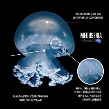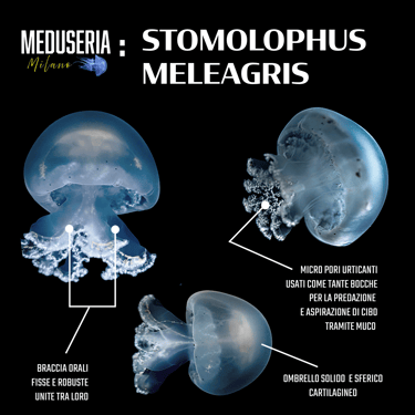 Questa specie di medusa grazie alla sua forma e con i suoi movimenti vivaci e decisi viene chiamata palla di cannone, basta vederla nuotare dal vivo per capirlo. Sicuramente rientra tra le prime specie che consiglio ma a differenza delle aurelia aurita, la palla di cannone(BLUE STOMOLOPHUS MELEAGRIS) ha delle necessità che se riesci a gestire ti proietta agli step successivi per diventare un abile collezionista di meduse...ovviamente vive. Nelle giuste condizioni cresce molto rapidamente, ma con una crescita rapida e un metabolismo elevato arrivano degli svantaggi. Il primo è il flusso adeguato che gli permetta di muoversi velocemente e di continuo perchè sono molto molto attive, quindi la portata oraria della pompa di risalita deve essere alta e regolata spesso in base alla crescita. Il secondo svantaggio è il cibo che deve avere a disposizione, svuotando velocemente lo stomaco per la loro vivacità devono ricevere altrettanto cibo per rimanere attive e qui arriva il famigerato manico. Se dai tanto cibo loro stanno momentaneamente bene ma la qualità dell'acqua rischia di crollare facendo saltare la stabilità della vasca, poi se offri cibo NON vivo, finirà sul fondo peggiorando la situazione velocemente perchè la gestione delle meduse non è come il marino classico con la fauna bentonica che fa da spazzino.....NON abbiamo sabbia roccia o anfratti. Ci sono diverse soluzioni che possono aiutarti tra cui la temperatura bassa che le rende piu' pigre quindi meno fameliche, anche il cibo vivo aiuta perchè essendo vivo rimane in colonna e se non viene predato con la prima abbuffata, rimarrà a disposizione per quella successiva senza inquinare....poi cosa molto importante, bisogna conoscere la propria vasca con la velocità di smaltimento dei rifiuti che varia e i cambi di acqua fatti nei momenti opportuni. Tutta roba che sperimentando si impara velocemente. Se la passione ti spinge non fermarti al primo ostacolo, le meduse palla di cannone ti daranno parecchie soddisfazioni, scorrendo troverai qualche video.
